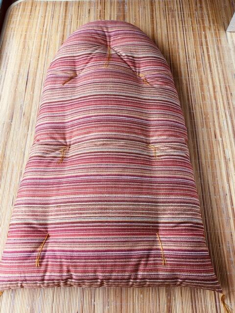 天然コットンをブレンドした中わたは、ほど良い柔らかさと弾力があるのでとってもナチュラルな寝心地です。仕事や家事などの途中、ちょっと一休みしたい時にお使いいただけると幸いです。本製品は南あわじ市にあります当店で、生地の裁断・縫製・綿入れ・仕上げを行っています。